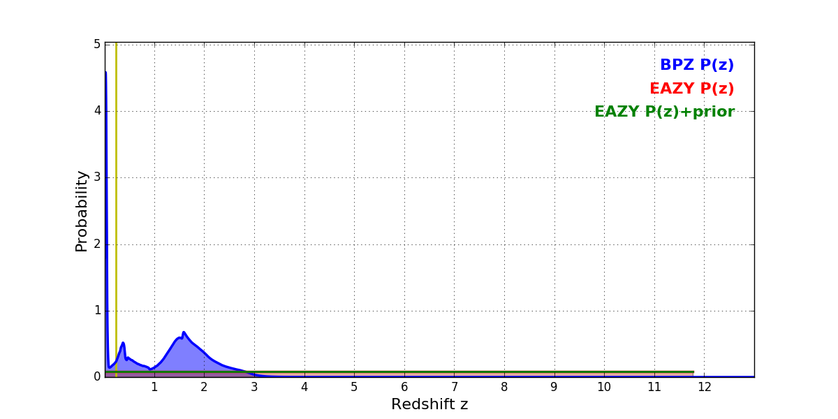 In P(z) plots: Yellow lines mark the cluster redshift z = 0.228,