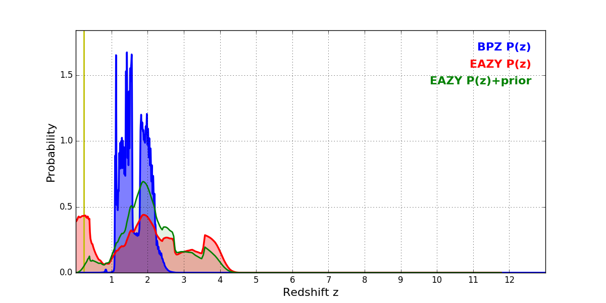 In P(z) plots: Yellow lines mark the cluster redshift z = 0.228,