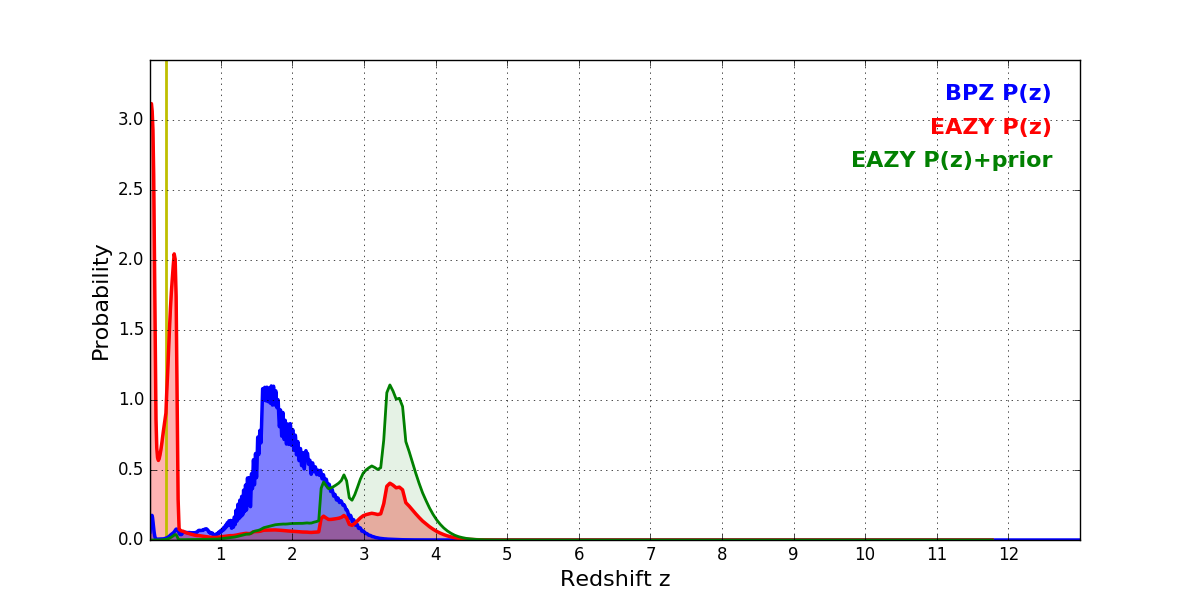 In P(z) plots: Yellow lines mark the cluster redshift z = 0.228,