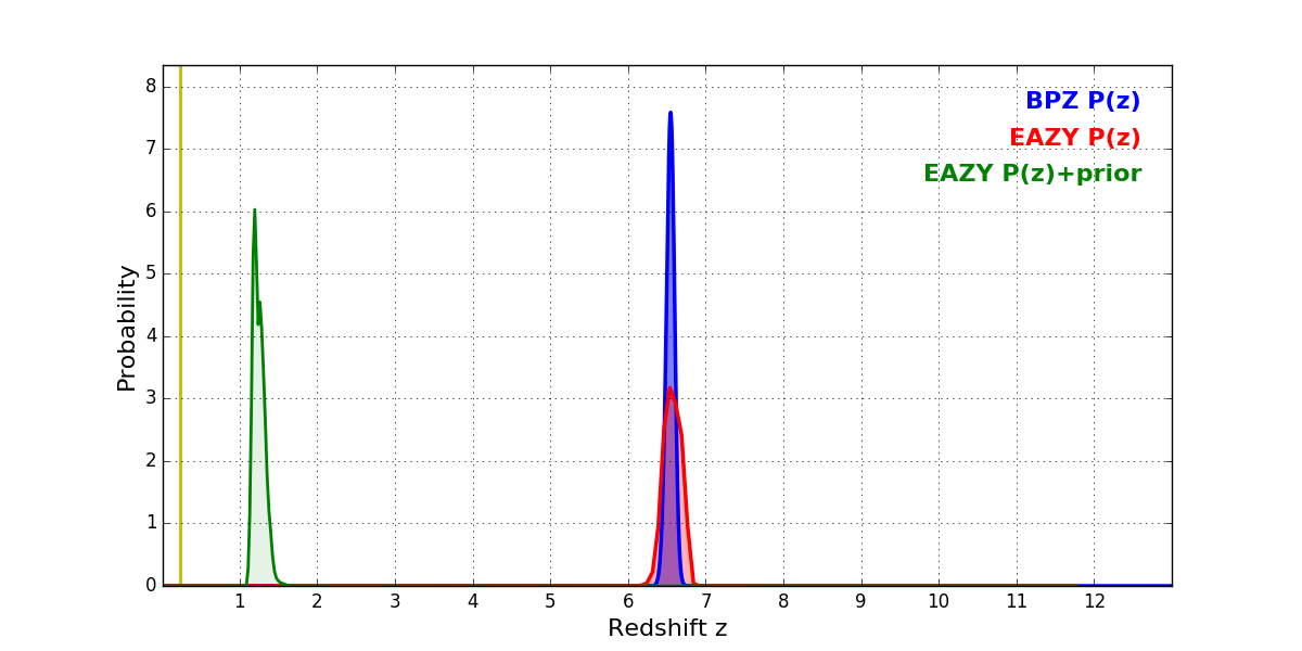 In P(z) plots: Yellow lines mark the cluster redshift z = 0.228,