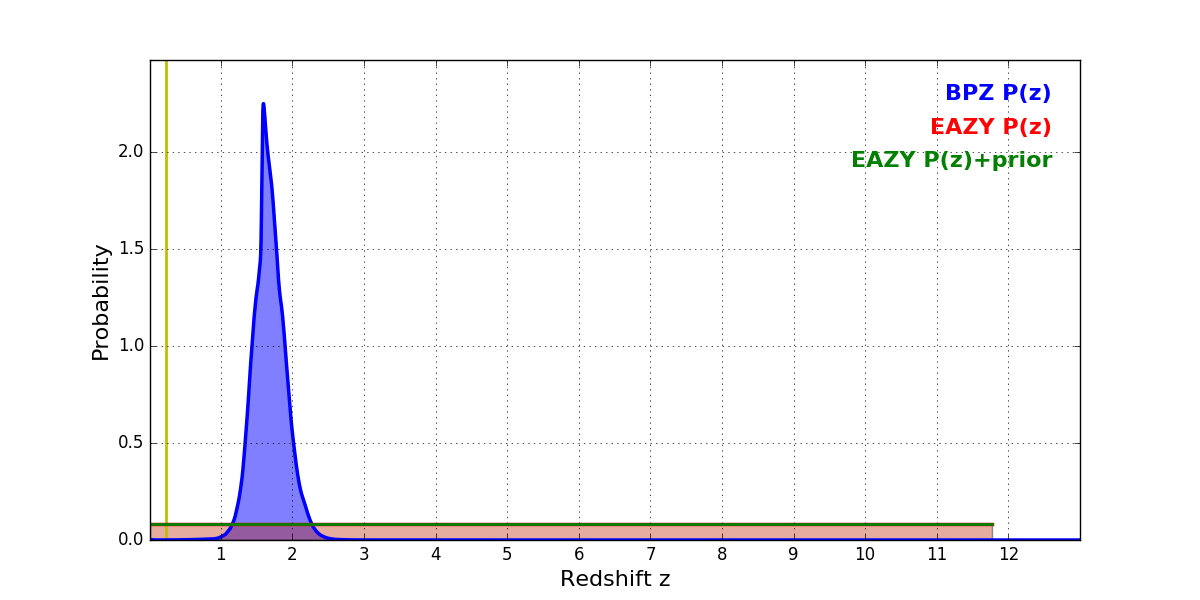 In P(z) plots: Yellow lines mark the cluster redshift z = 0.228,