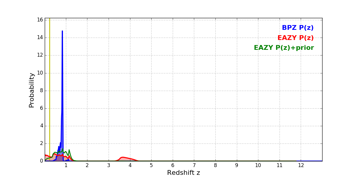 In P(z) plots: Yellow lines mark the cluster redshift z = 0.228,