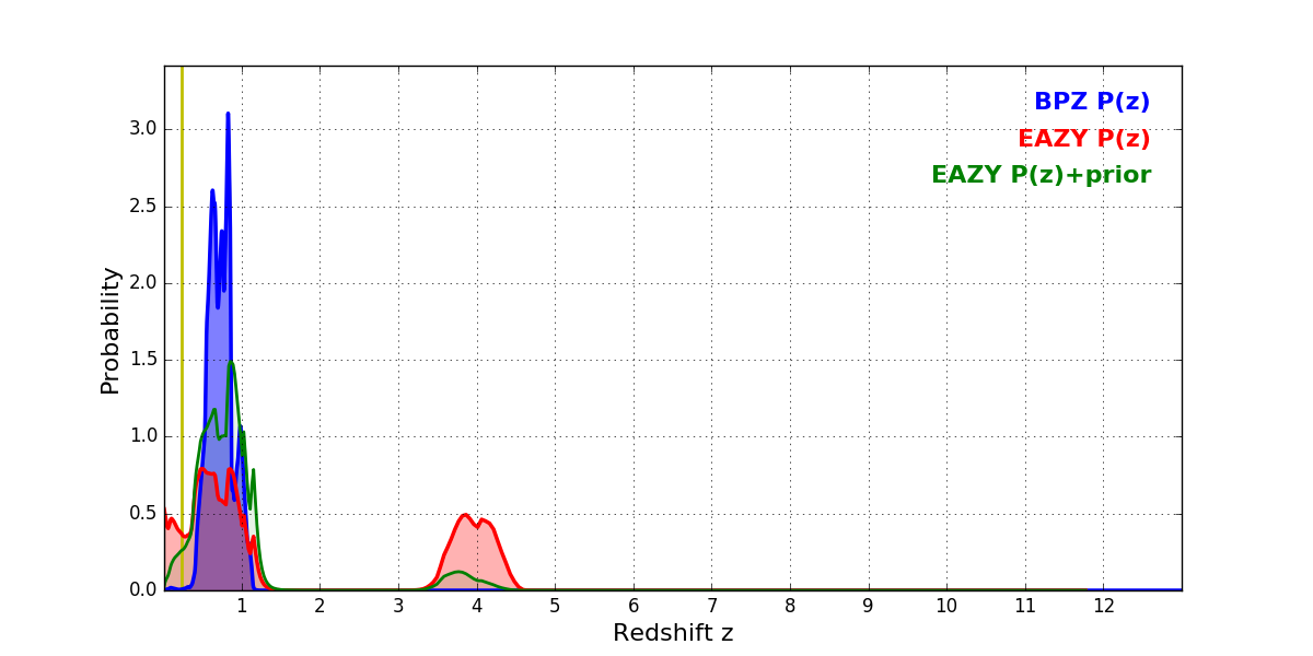 In P(z) plots: Yellow lines mark the cluster redshift z = 0.228,