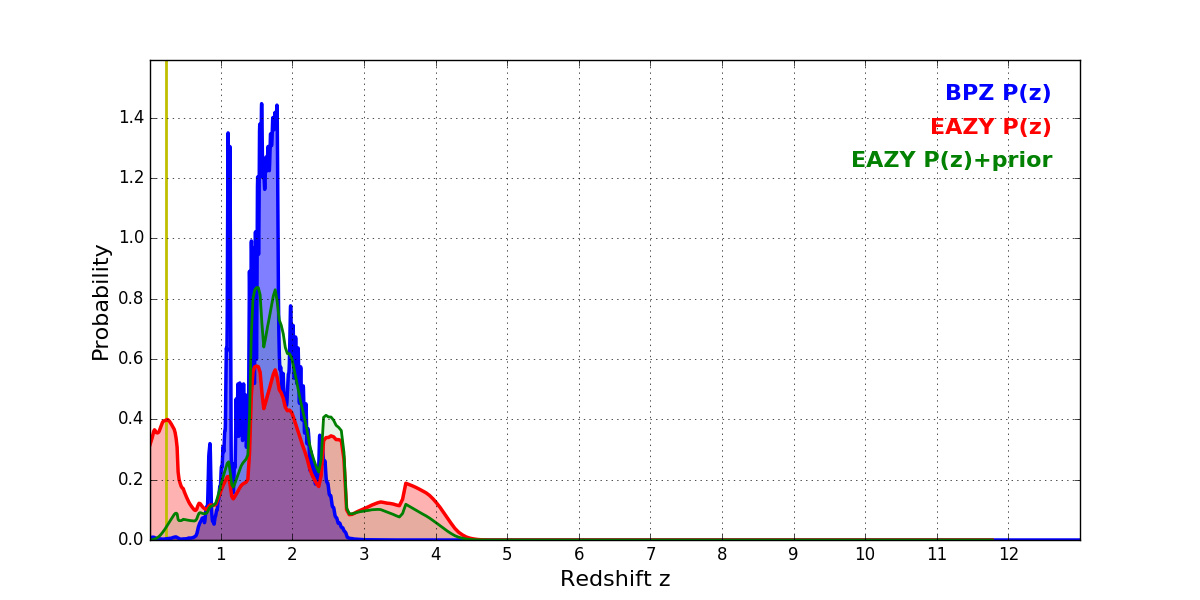 In P(z) plots: Yellow lines mark the cluster redshift z = 0.228,