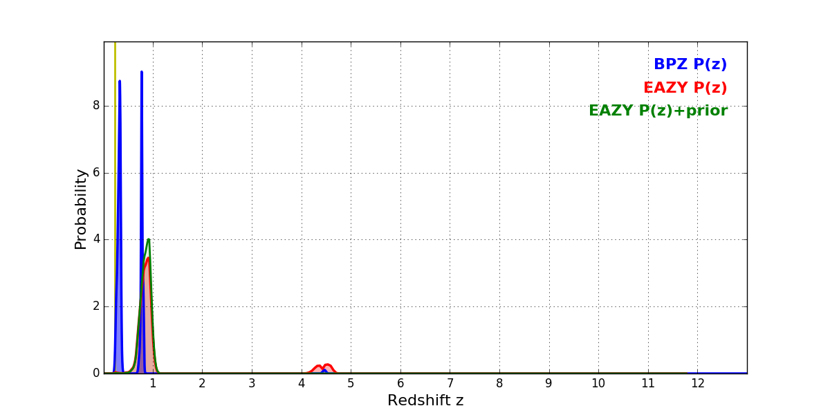 In P(z) plots: Yellow lines mark the cluster redshift z = 0.228,