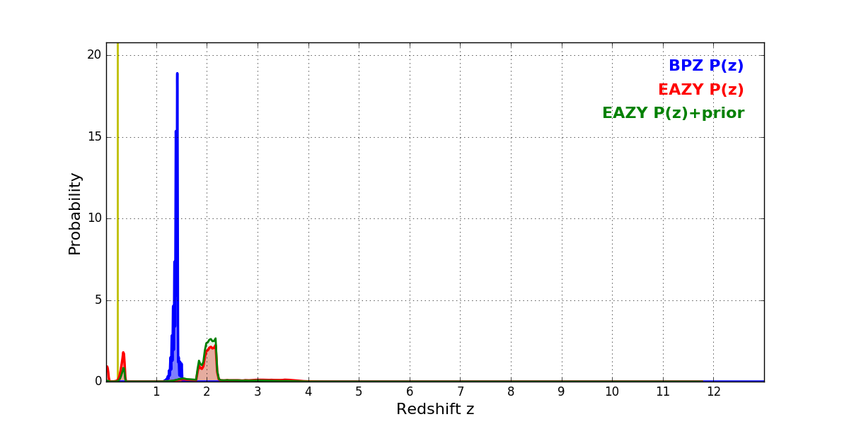 In P(z) plots: Yellow lines mark the cluster redshift z = 0.228,