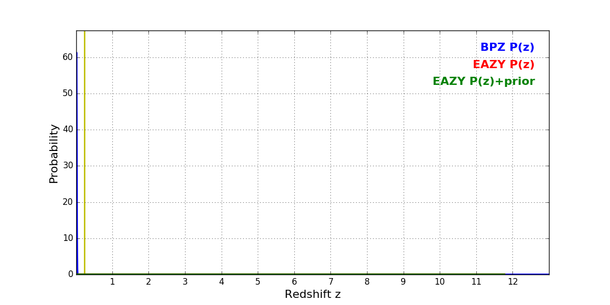 In P(z) plots: Yellow lines mark the cluster redshift z = 0.228,