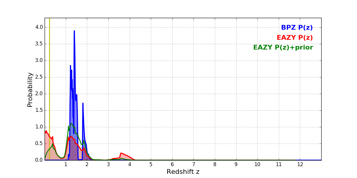 In P(z) plots: Yellow lines mark the cluster redshift z = 0.228,