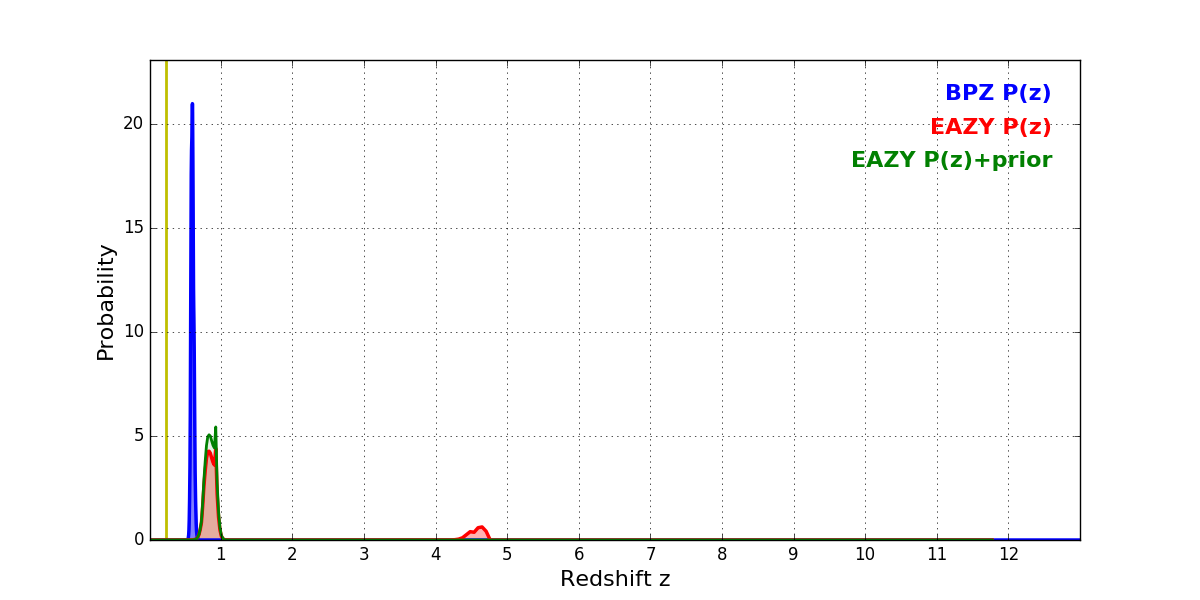 In P(z) plots: Yellow lines mark the cluster redshift z = 0.228,