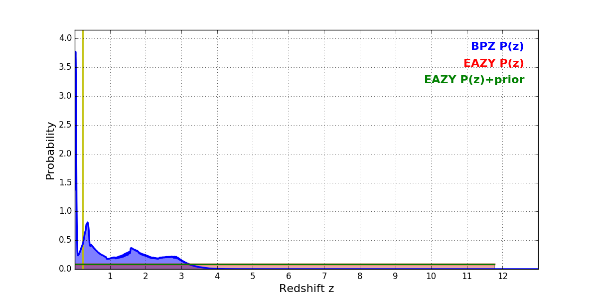 In P(z) plots: Yellow lines mark the cluster redshift z = 0.228,
