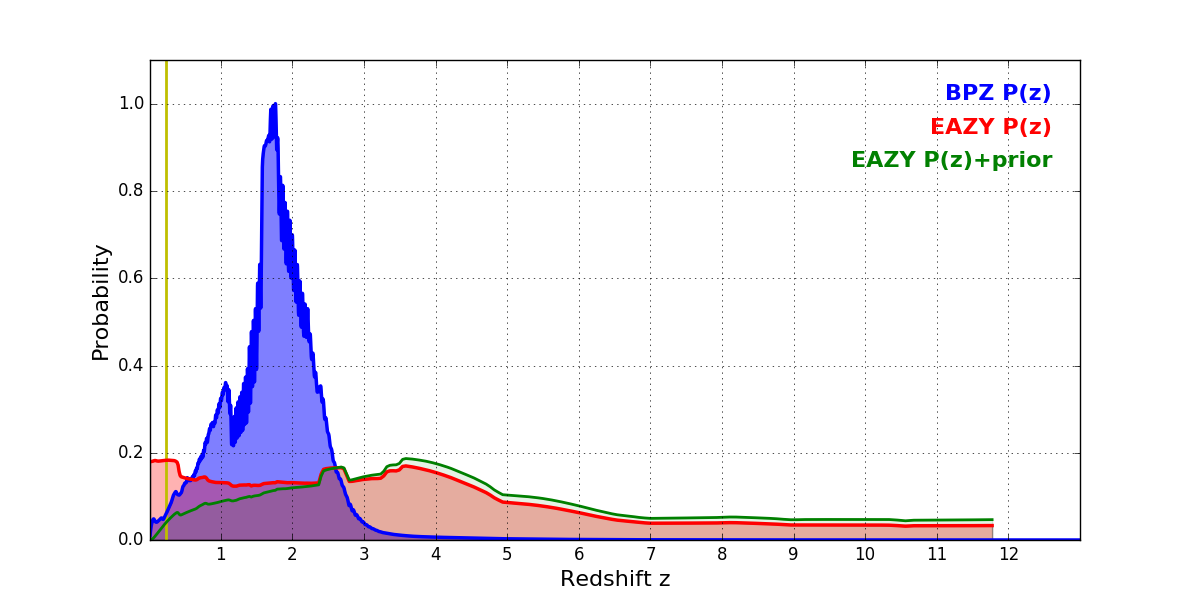 In P(z) plots: Yellow lines mark the cluster redshift z = 0.228,