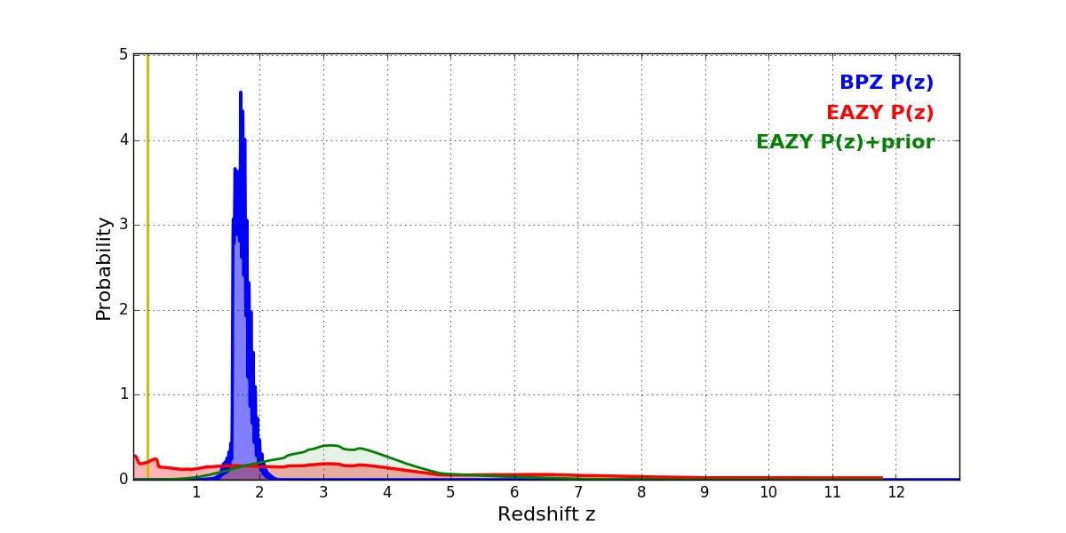 In P(z) plots: Yellow lines mark the cluster redshift z = 0.228,