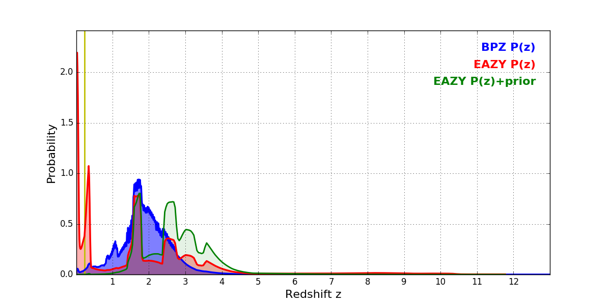 In P(z) plots: Yellow lines mark the cluster redshift z = 0.228,