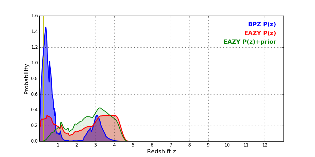 In P(z) plots: Yellow lines mark the cluster redshift z = 0.228,