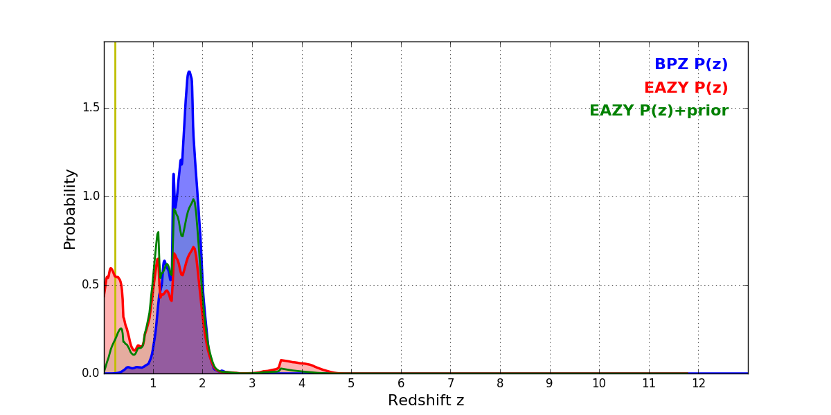 In P(z) plots: Yellow lines mark the cluster redshift z = 0.228,