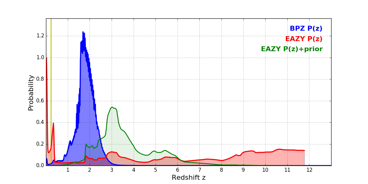 In P(z) plots: Yellow lines mark the cluster redshift z = 0.228,