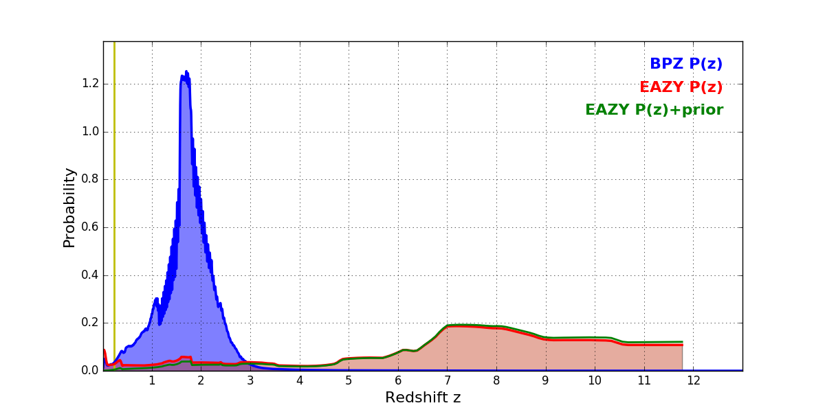 In P(z) plots: Yellow lines mark the cluster redshift z = 0.228,