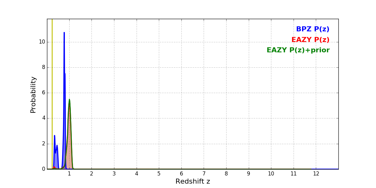 In P(z) plots: Yellow lines mark the cluster redshift z = 0.228,