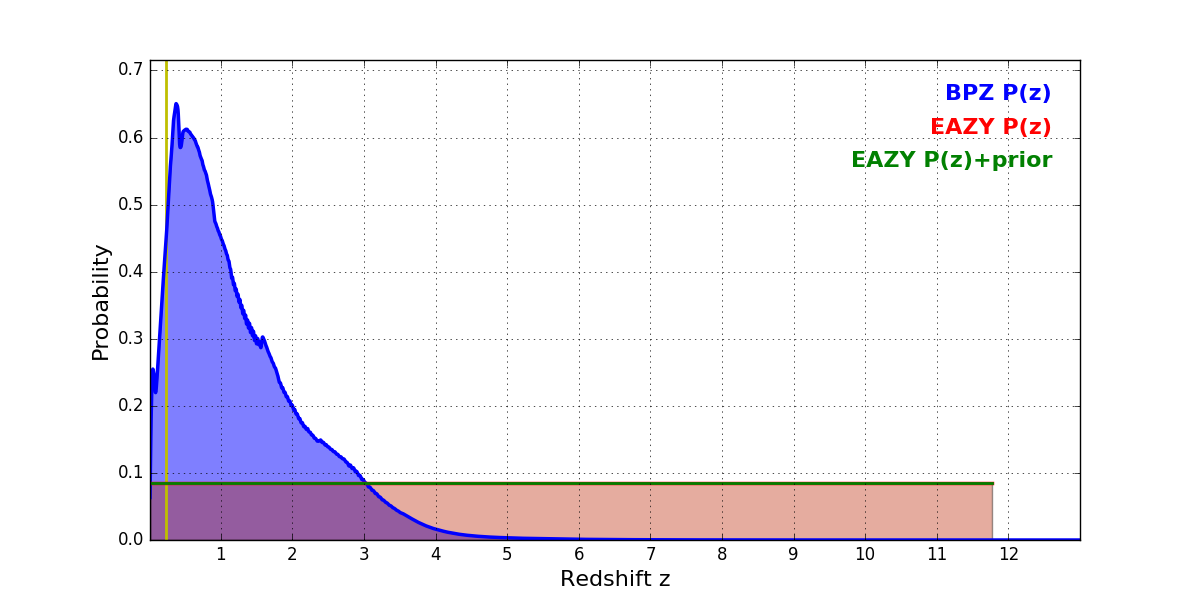 In P(z) plots: Yellow lines mark the cluster redshift z = 0.228,