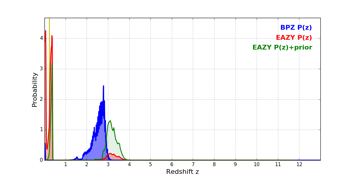In P(z) plots: Yellow lines mark the cluster redshift z = 0.228,