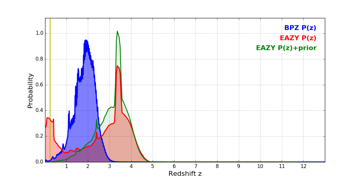 In P(z) plots: Yellow lines mark the cluster redshift z = 0.228,