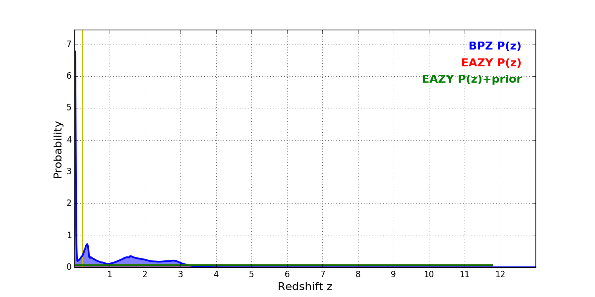 In P(z) plots: Yellow lines mark the cluster redshift z = 0.228,