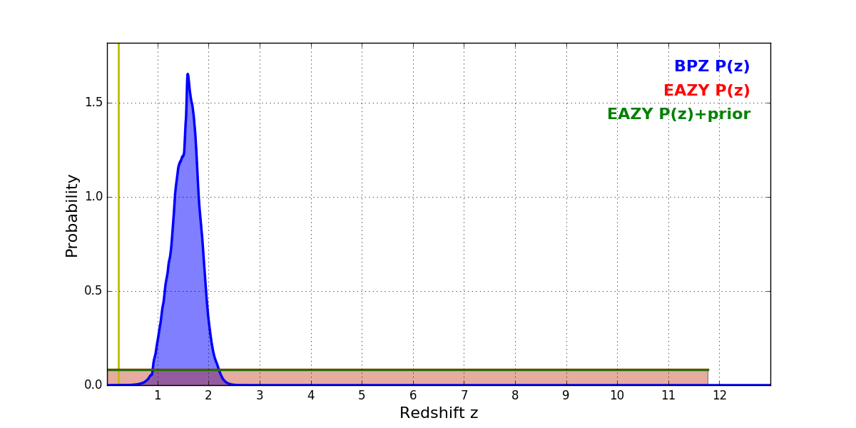 In P(z) plots: Yellow lines mark the cluster redshift z = 0.228,