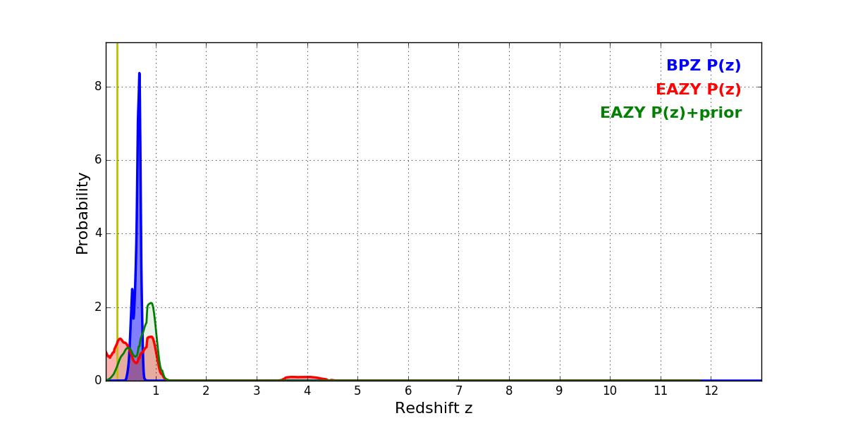 In P(z) plots: Yellow lines mark the cluster redshift z = 0.228,