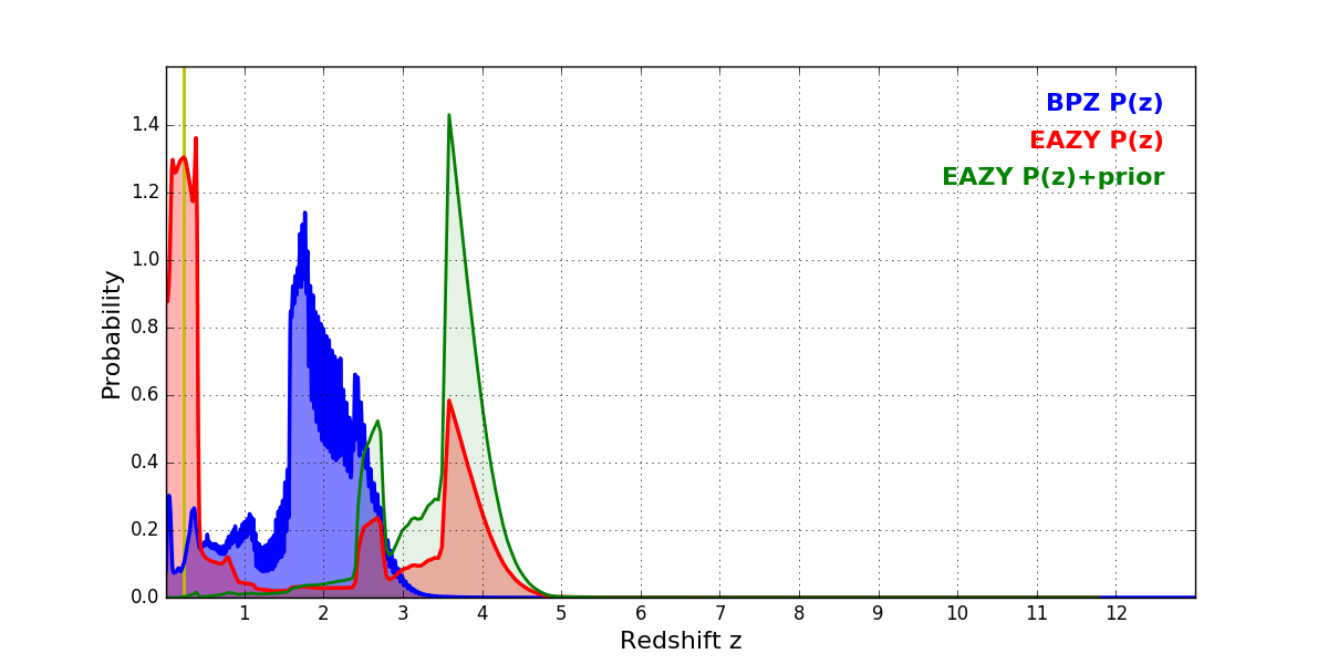 In P(z) plots: Yellow lines mark the cluster redshift z = 0.228,