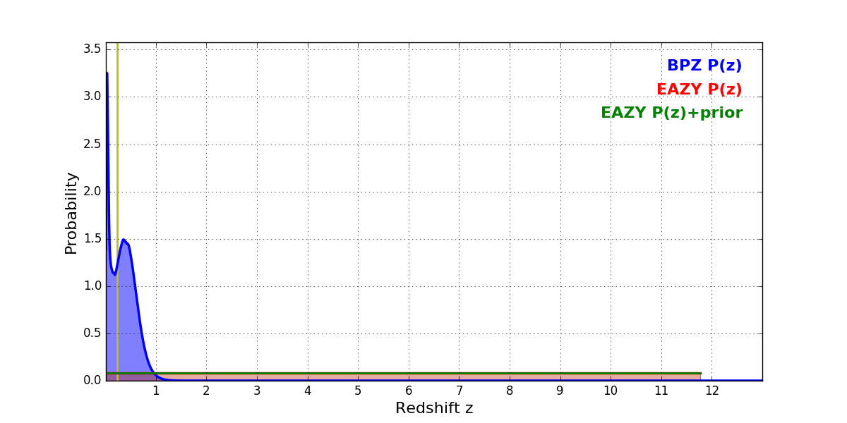 In P(z) plots: Yellow lines mark the cluster redshift z = 0.228,
