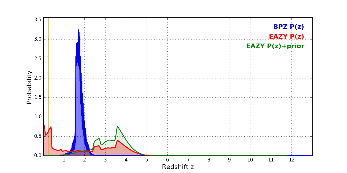 In P(z) plots: Yellow lines mark the cluster redshift z = 0.228,