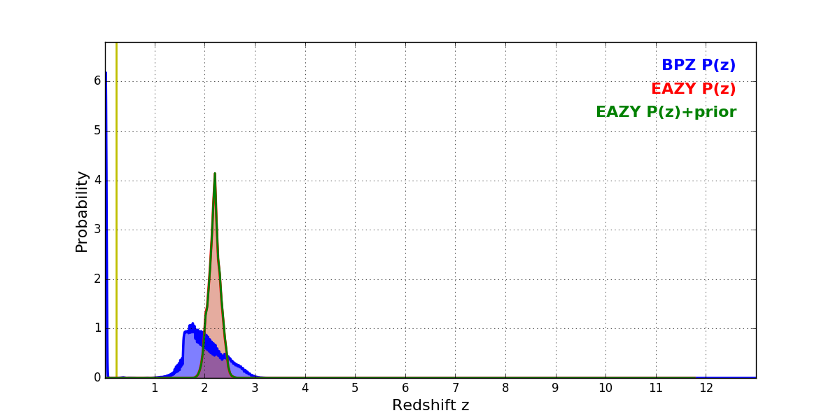 In P(z) plots: Yellow lines mark the cluster redshift z = 0.228,