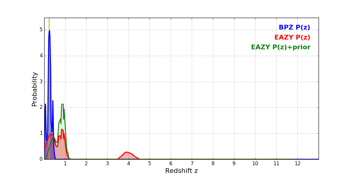 In P(z) plots: Yellow lines mark the cluster redshift z = 0.228,