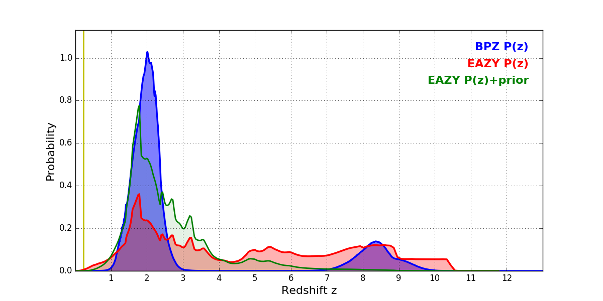 In P(z) plots: Yellow lines mark the cluster redshift z = 0.228,