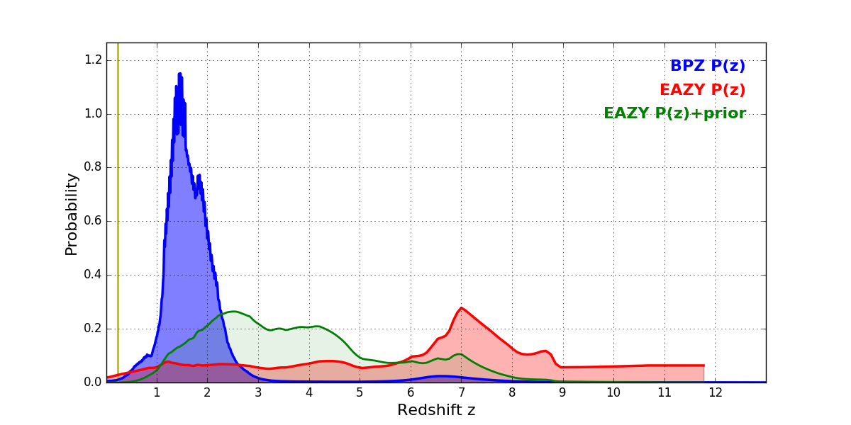 In P(z) plots: Yellow lines mark the cluster redshift z = 0.228,
