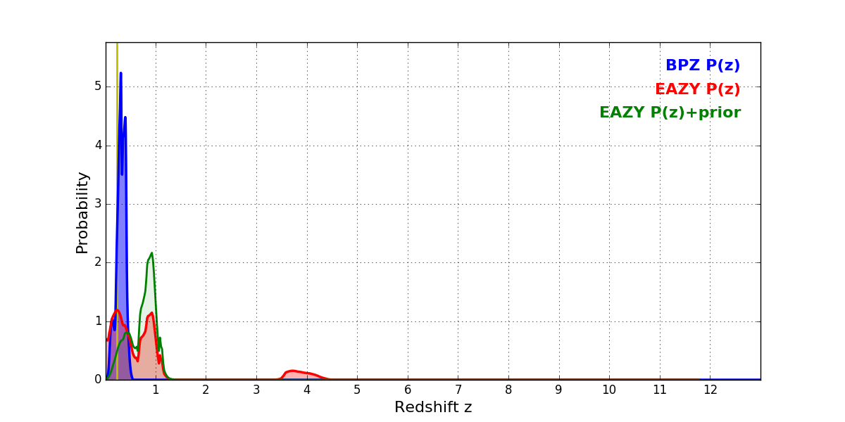 In P(z) plots: Yellow lines mark the cluster redshift z = 0.228,