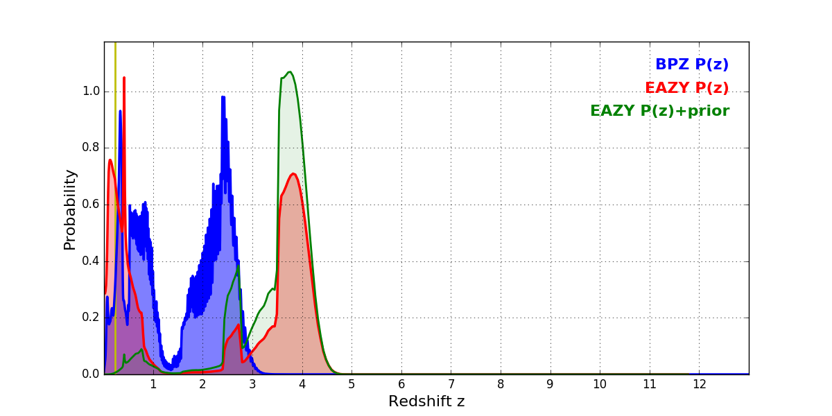 In P(z) plots: Yellow lines mark the cluster redshift z = 0.228,