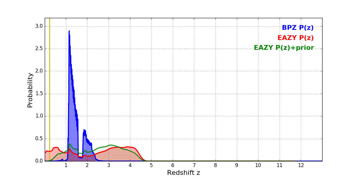 In P(z) plots: Yellow lines mark the cluster redshift z = 0.228,