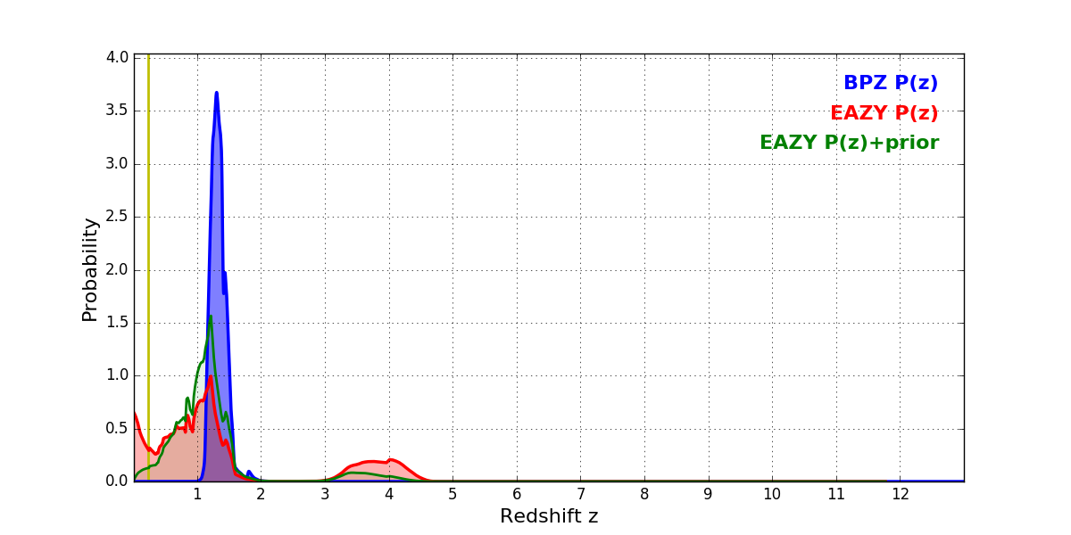 In P(z) plots: Yellow lines mark the cluster redshift z = 0.228,