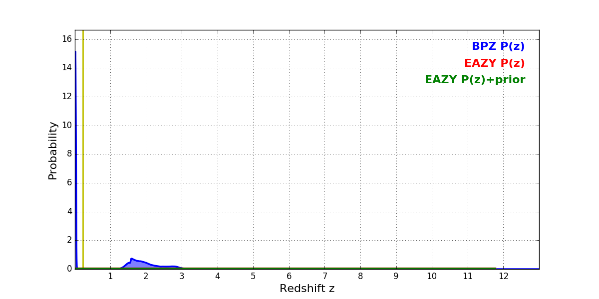 In P(z) plots: Yellow lines mark the cluster redshift z = 0.228,