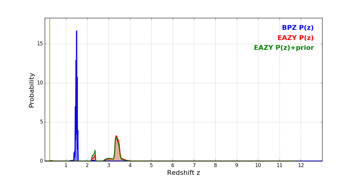 In P(z) plots: Yellow lines mark the cluster redshift z = 0.228,