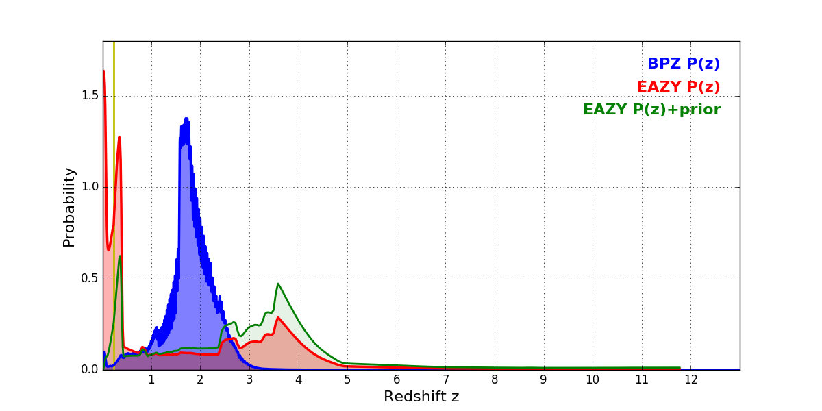In P(z) plots: Yellow lines mark the cluster redshift z = 0.228,