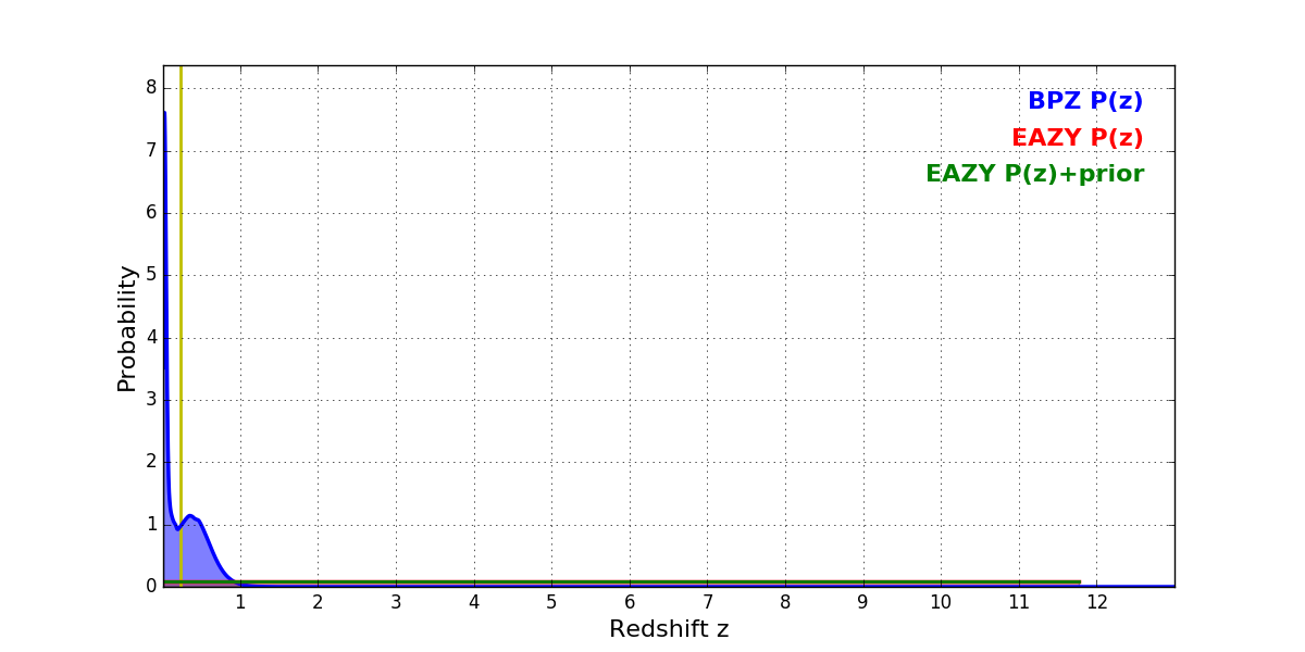 In P(z) plots: Yellow lines mark the cluster redshift z = 0.228,