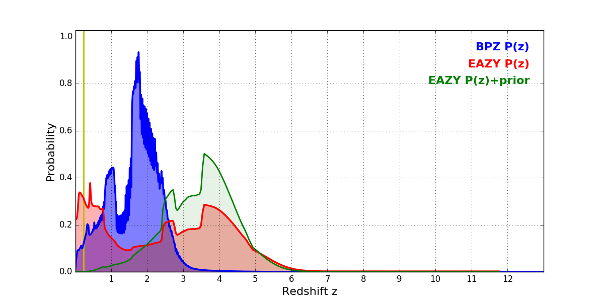 In P(z) plots: Yellow lines mark the cluster redshift z = 0.228,