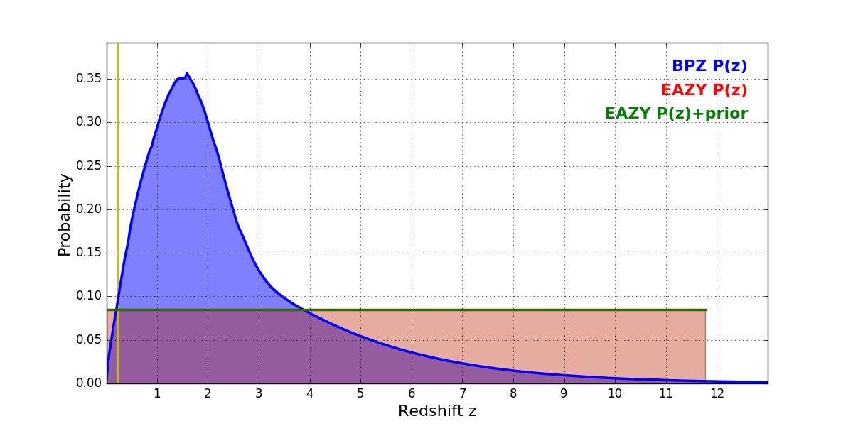 In P(z) plots: Yellow lines mark the cluster redshift z = 0.228,