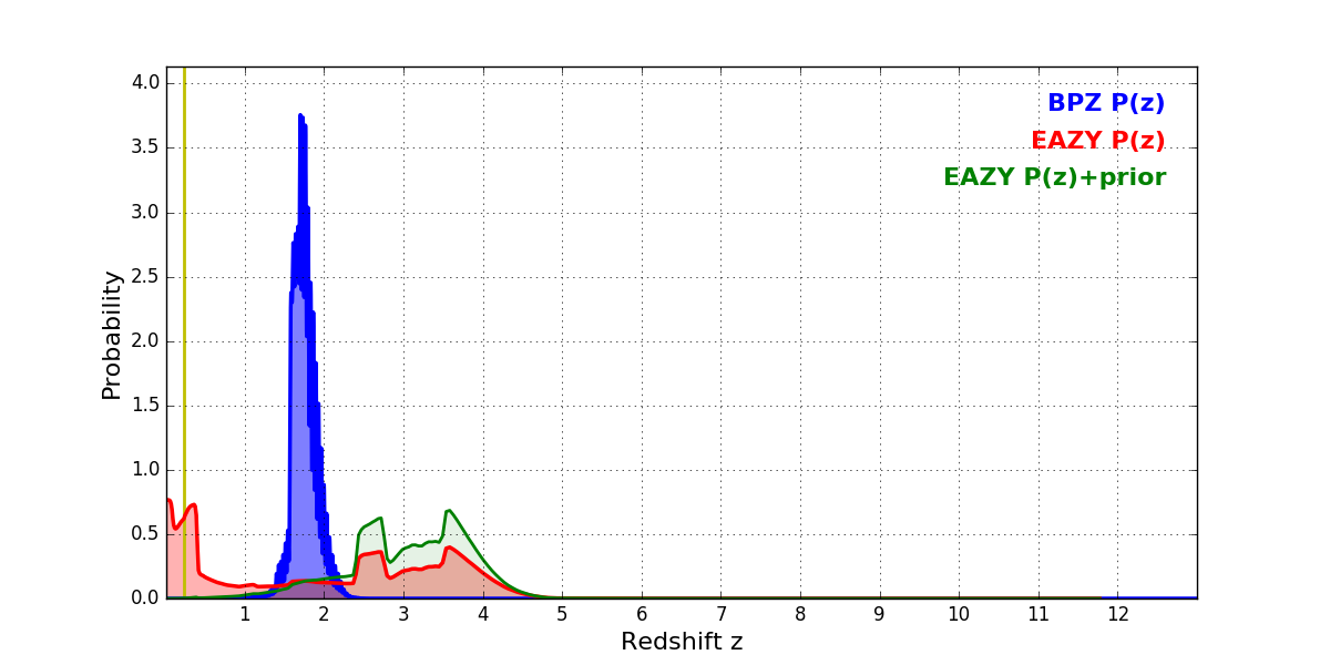 In P(z) plots: Yellow lines mark the cluster redshift z = 0.228,