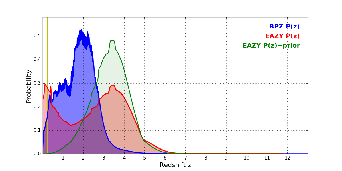 In P(z) plots: Yellow lines mark the cluster redshift z = 0.228,