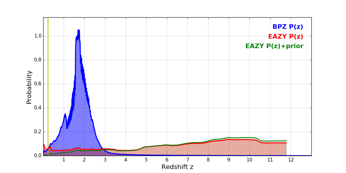 In P(z) plots: Yellow lines mark the cluster redshift z = 0.228,