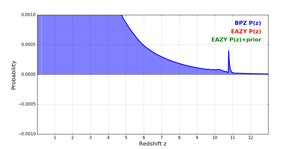 In P(z) plots: Yellow lines mark the cluster redshift z = 0.228,