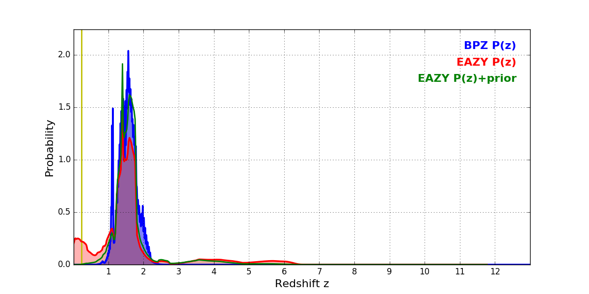 In P(z) plots: Yellow lines mark the cluster redshift z = 0.228,